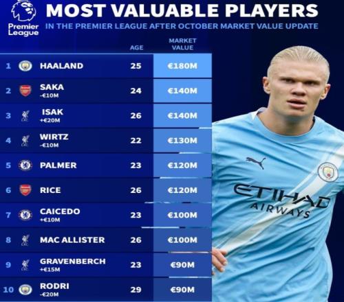 英超球员身价榜公布:哈兰德1.8亿断崖式领先,利物浦成最大赢家